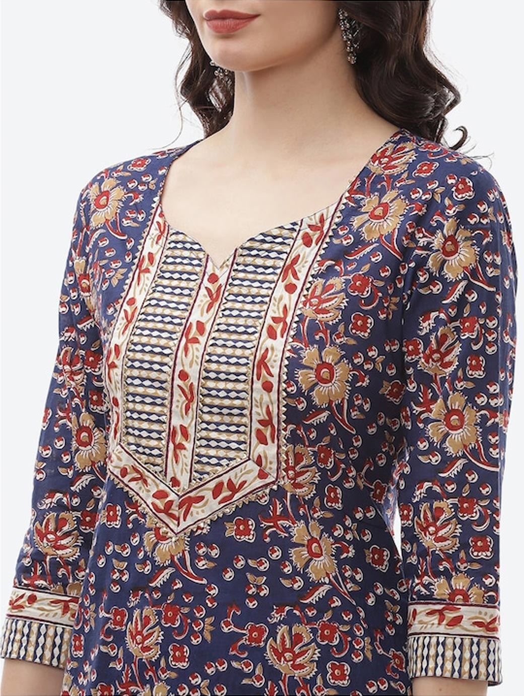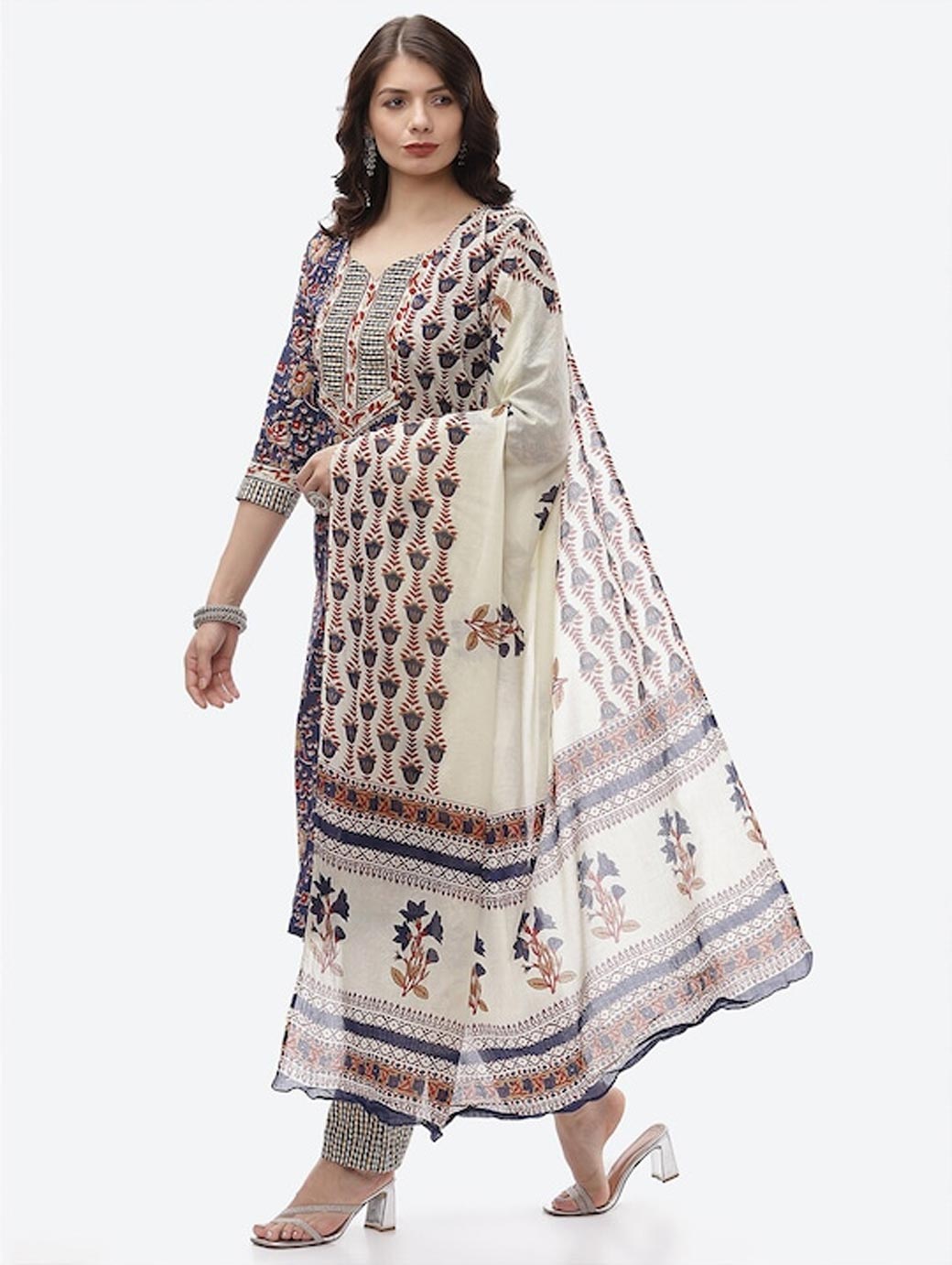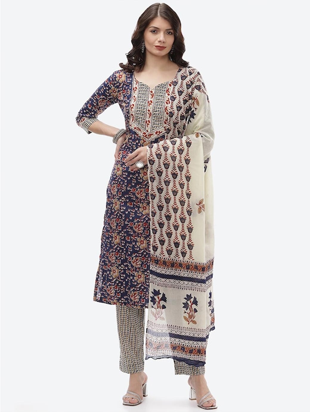 Blue and off white printed kurta fabric