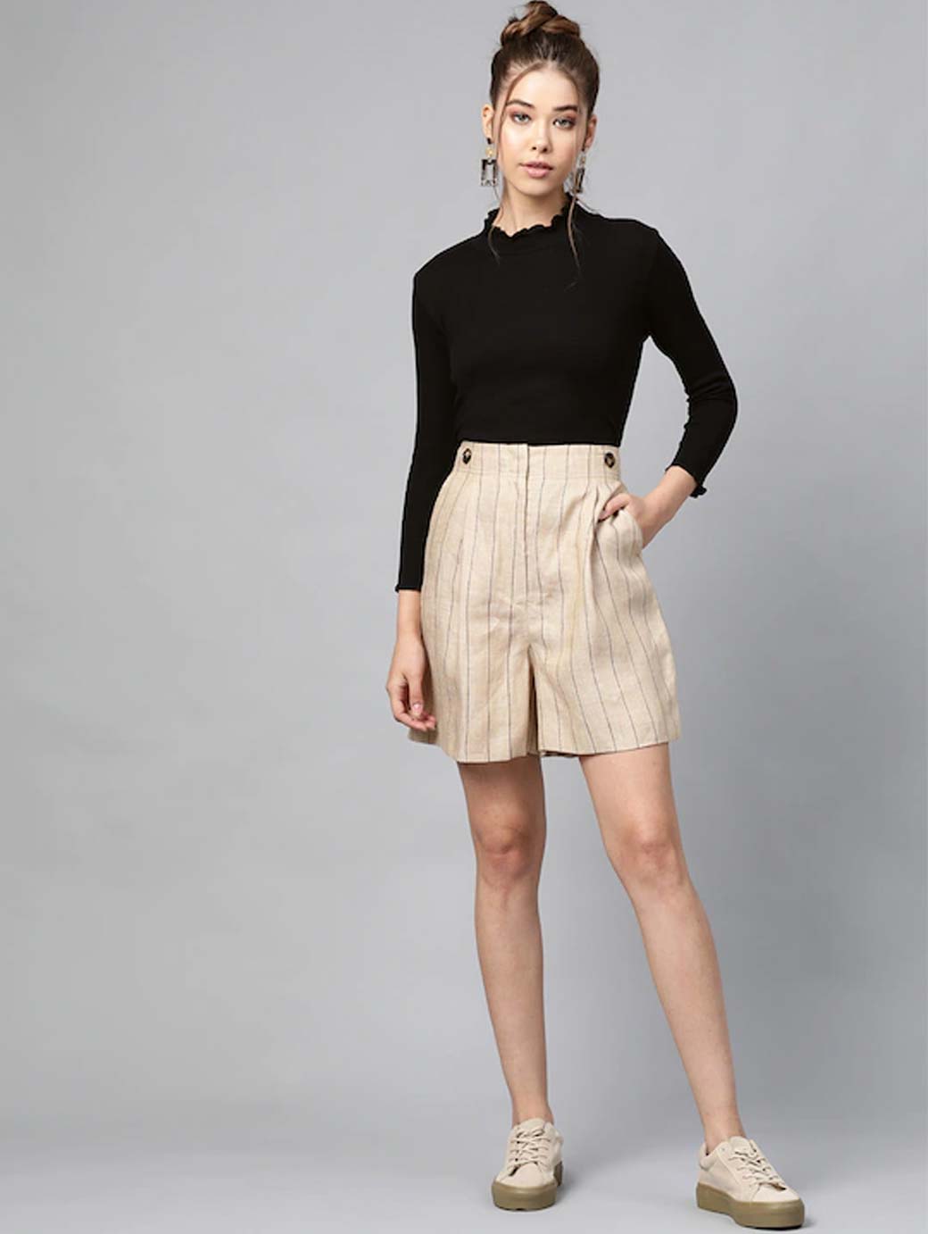 Black solid knitted crop top, has a high neck, and long sleeves