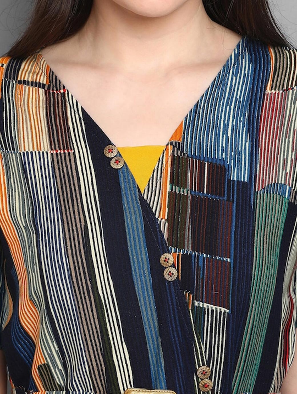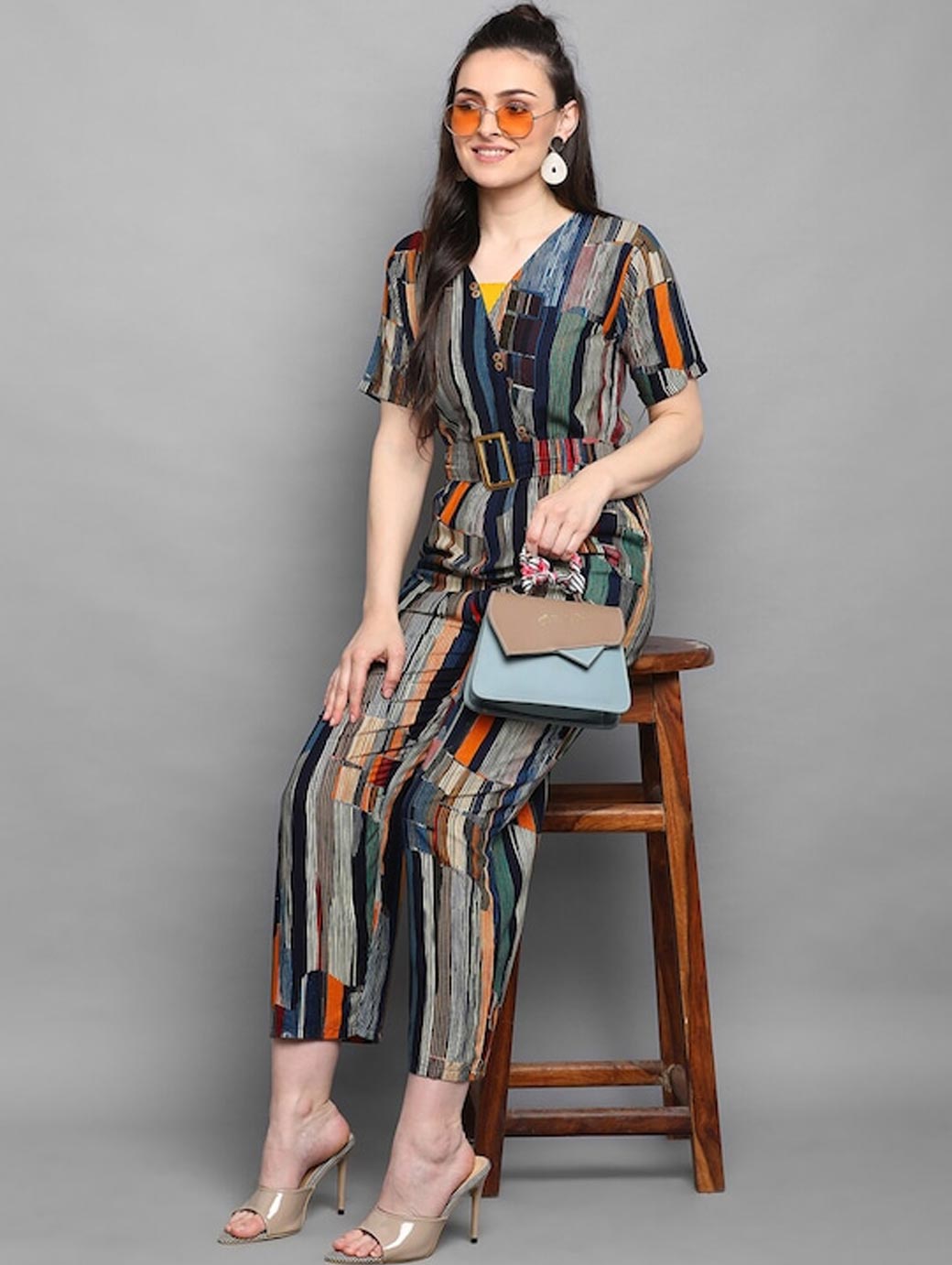 Blue and orange printed basic jumpsuit ,has a v-neck, short sleeves, 2 pocketS.