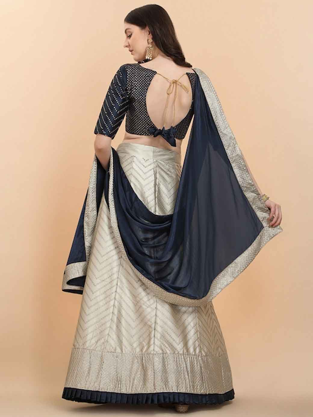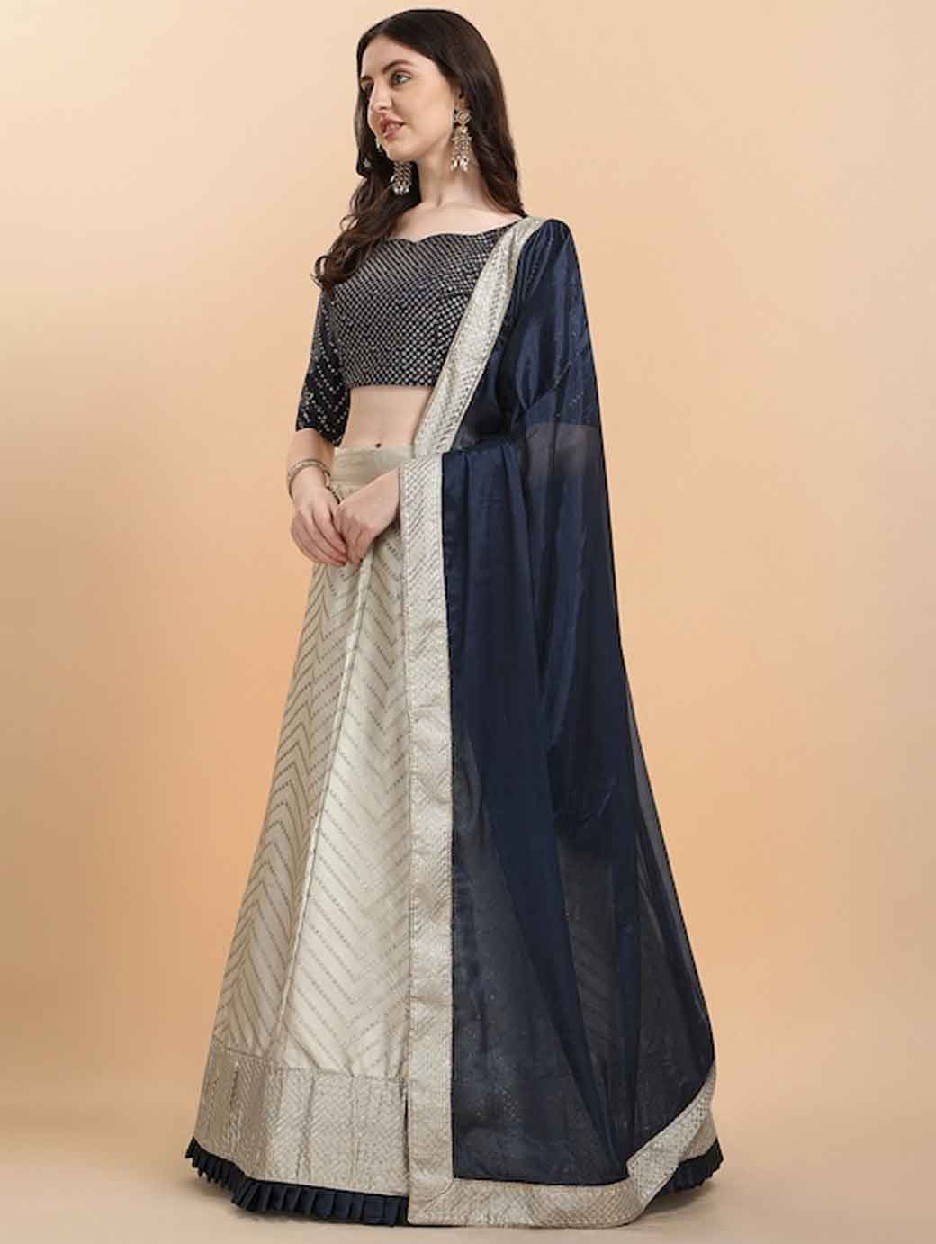 Cream-coloured and navy blue embellished lehenga choli with dupatta, sequinned