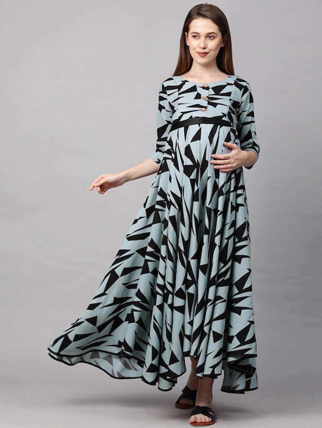 Grey and black geometric print maxi dress Round neck Three-quarter, regular sleeves Maxi length in flared hem Concealed zip closure