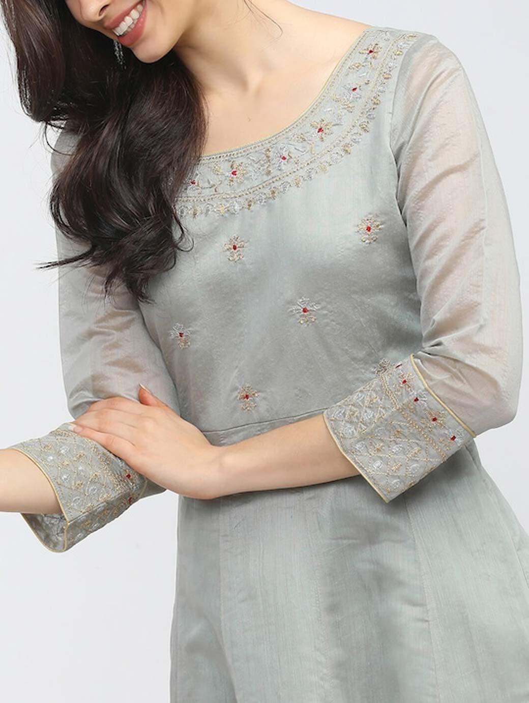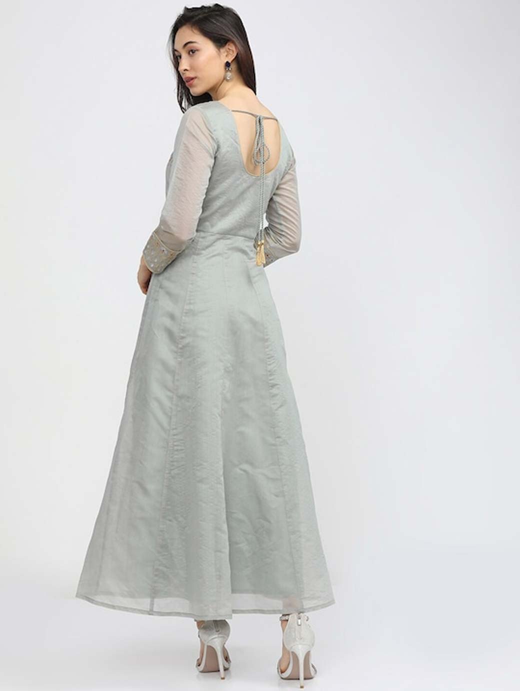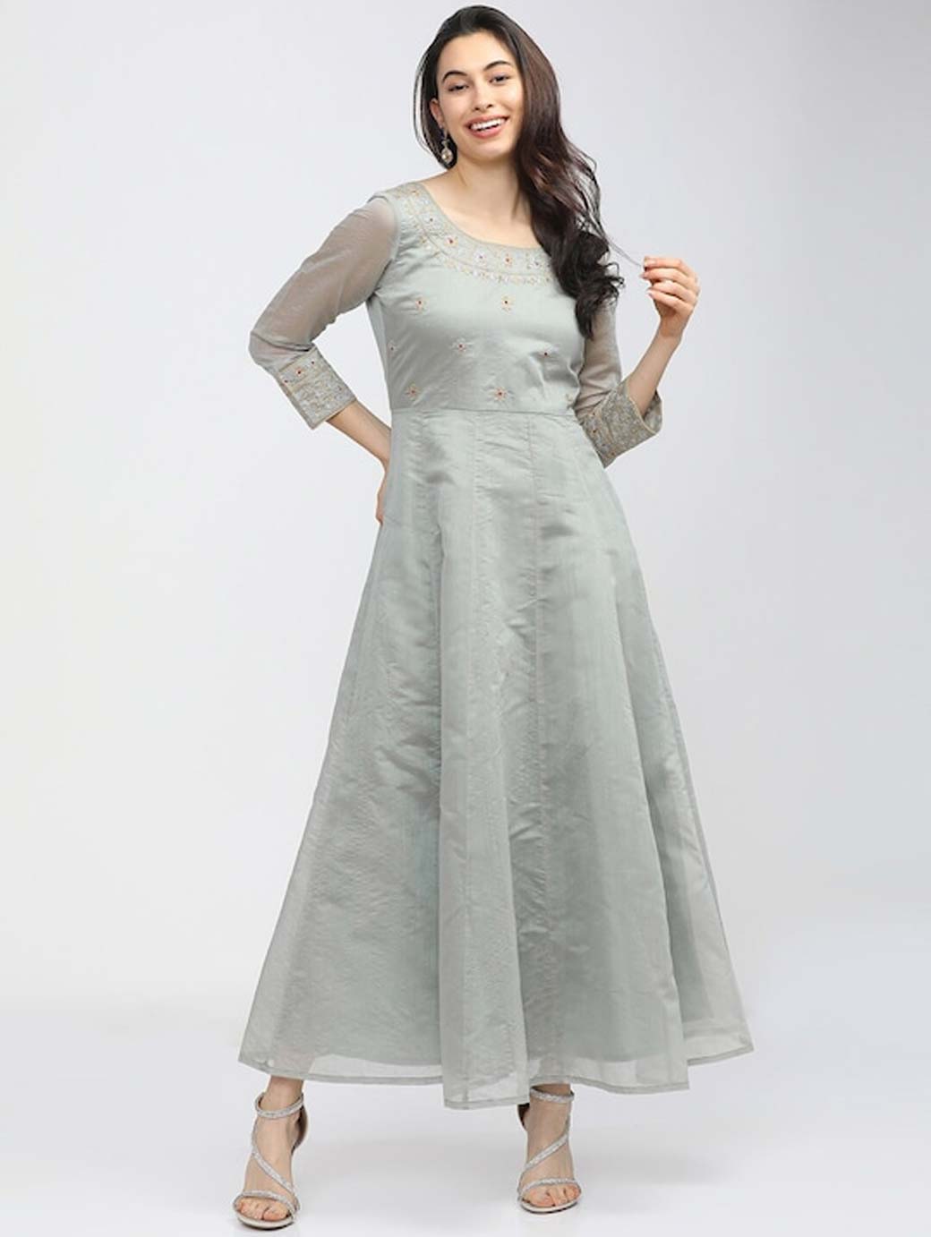 Grey floral embroidered maxi dress Square neck Three-quarter, regular sleeves Maxi length in flared hem