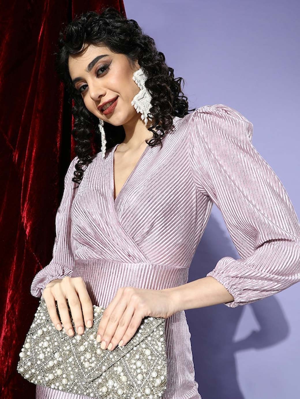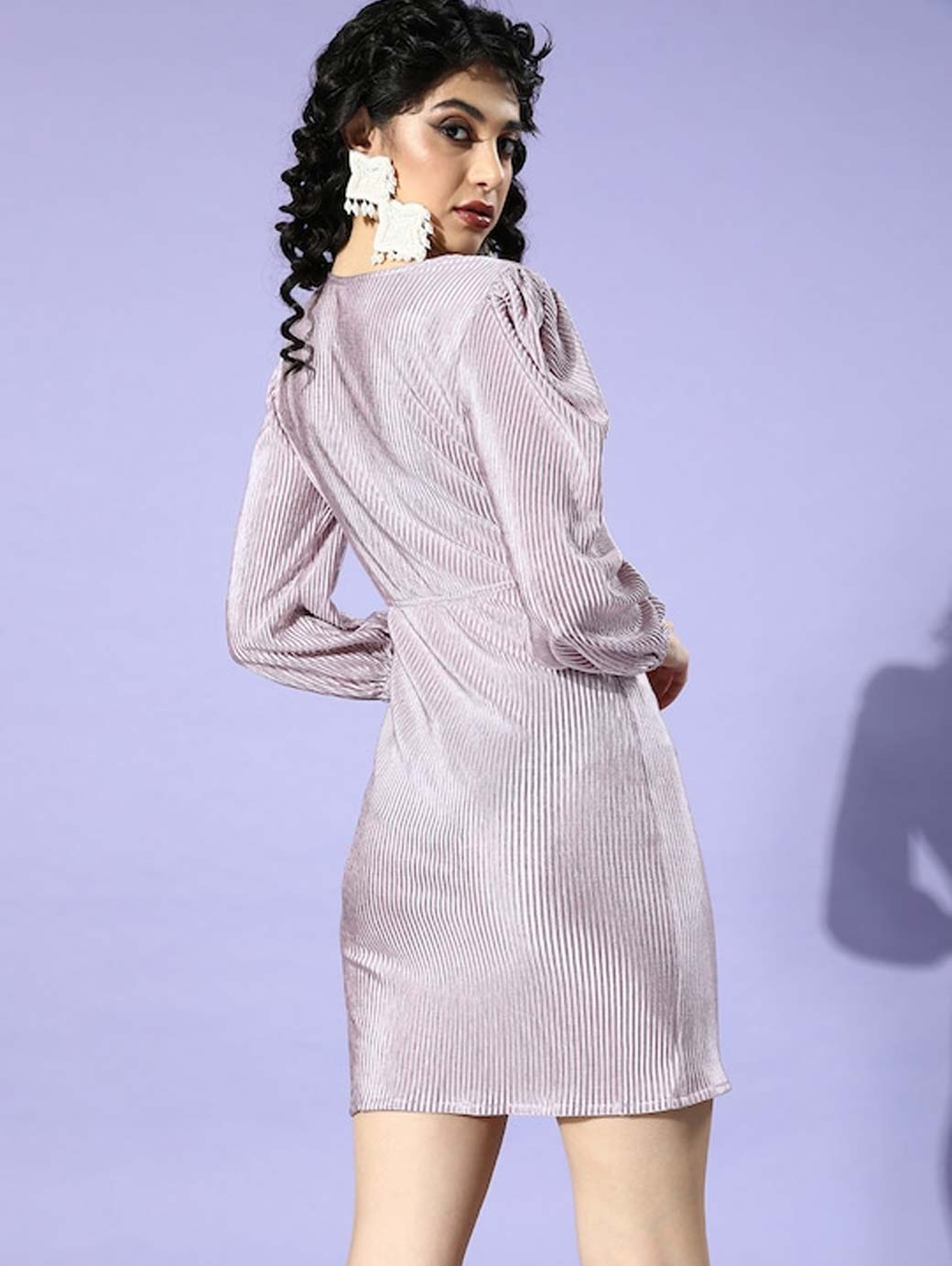 Lavender solid wrap dress, V-neck, Long, puff sleeve, Embellished detail, Above knee length in straight hem.