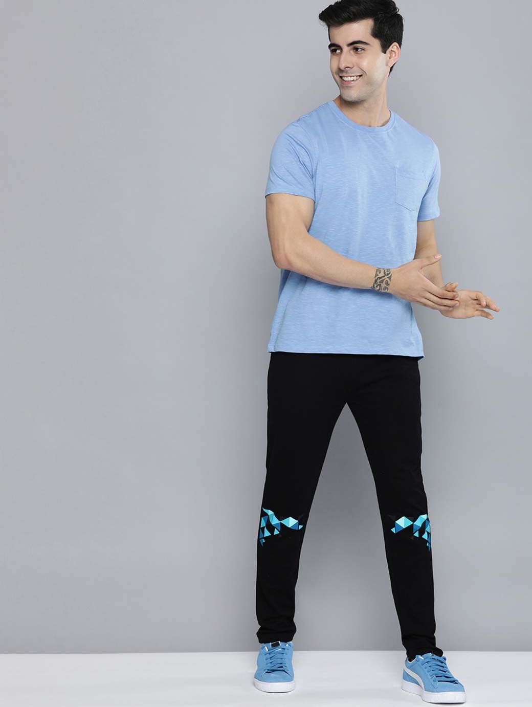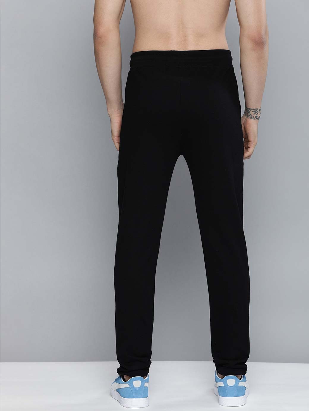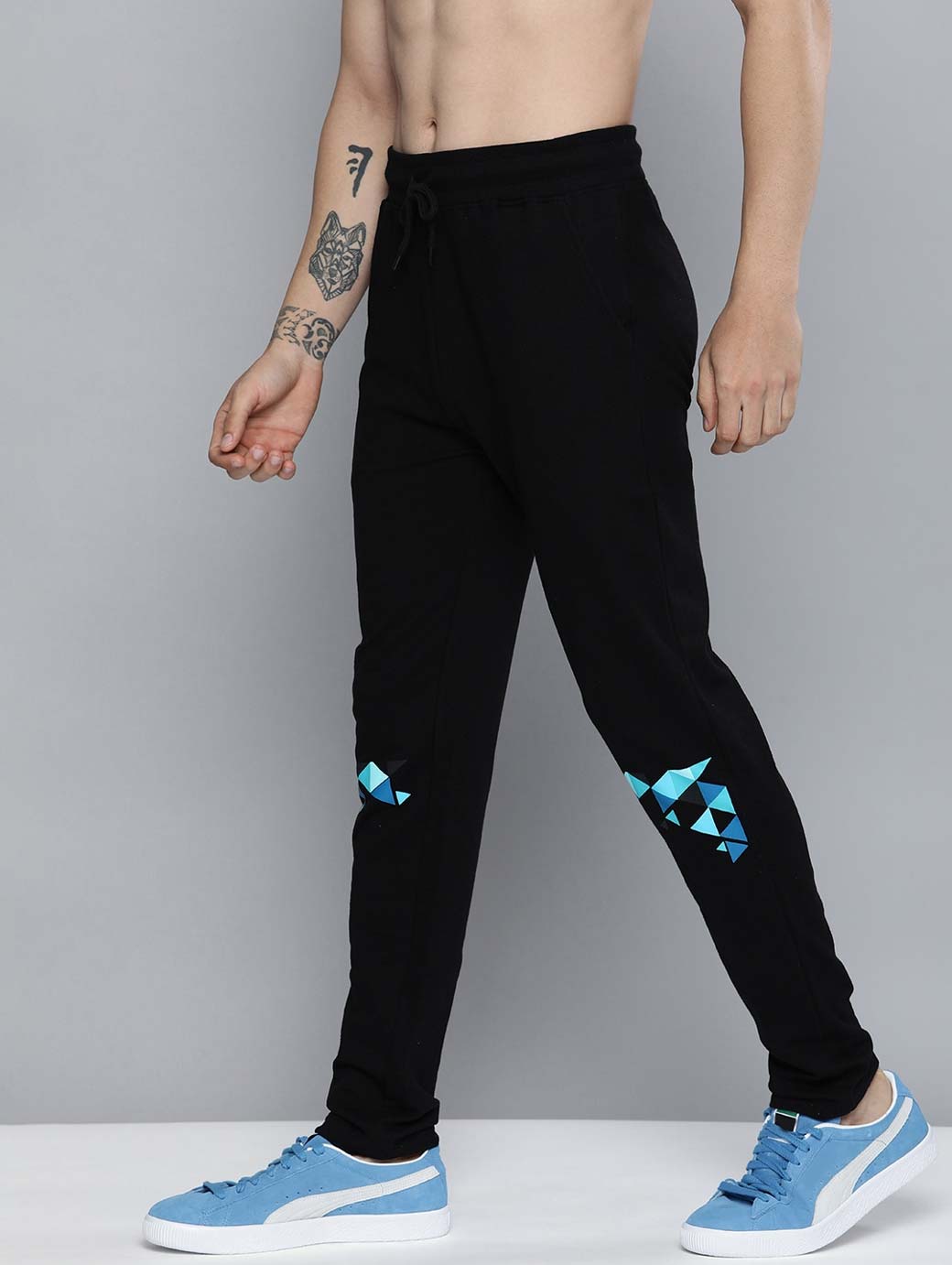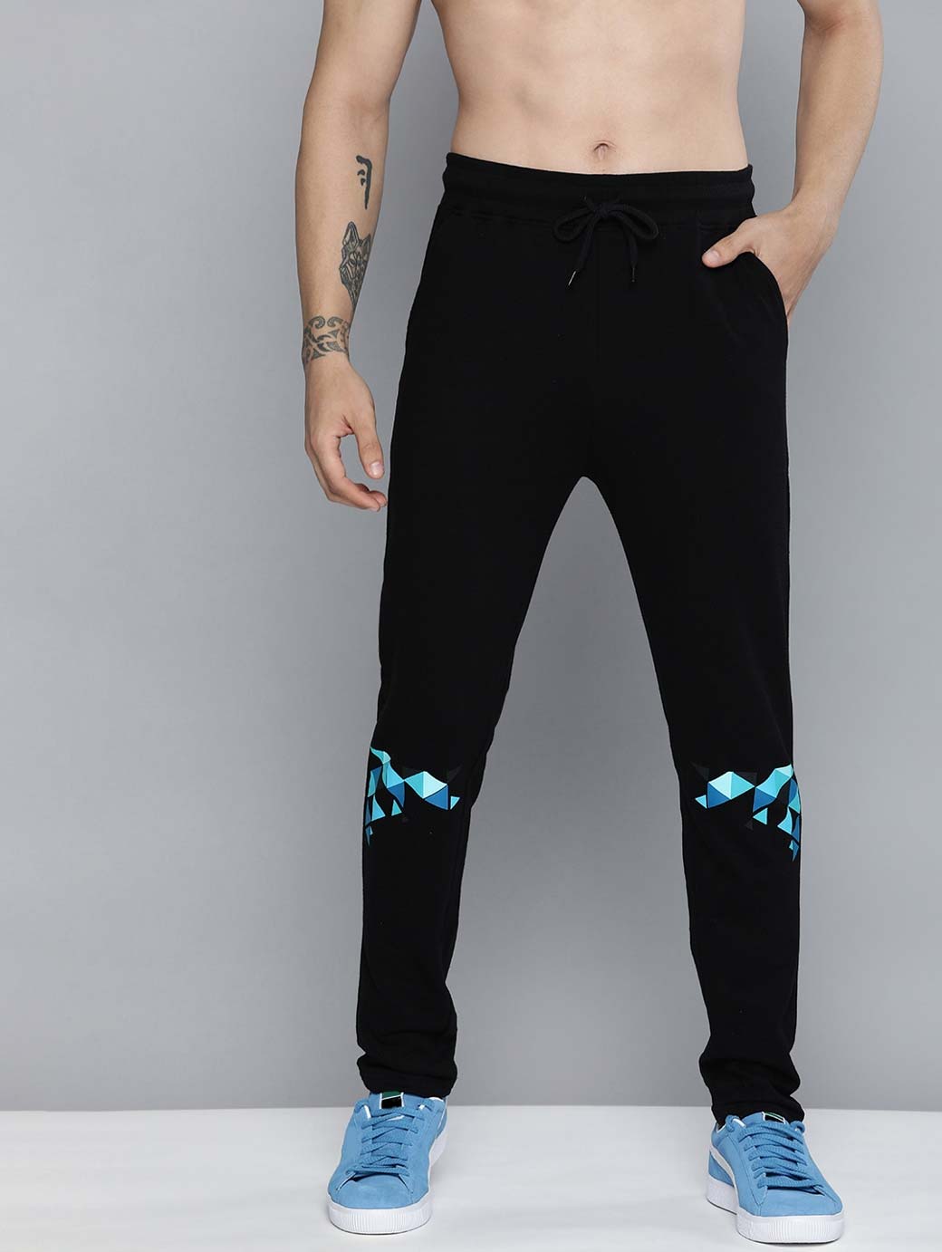 Black and blue printed mid-rise track pants, has an elasticated waistband with drawstring fastening, two pockets