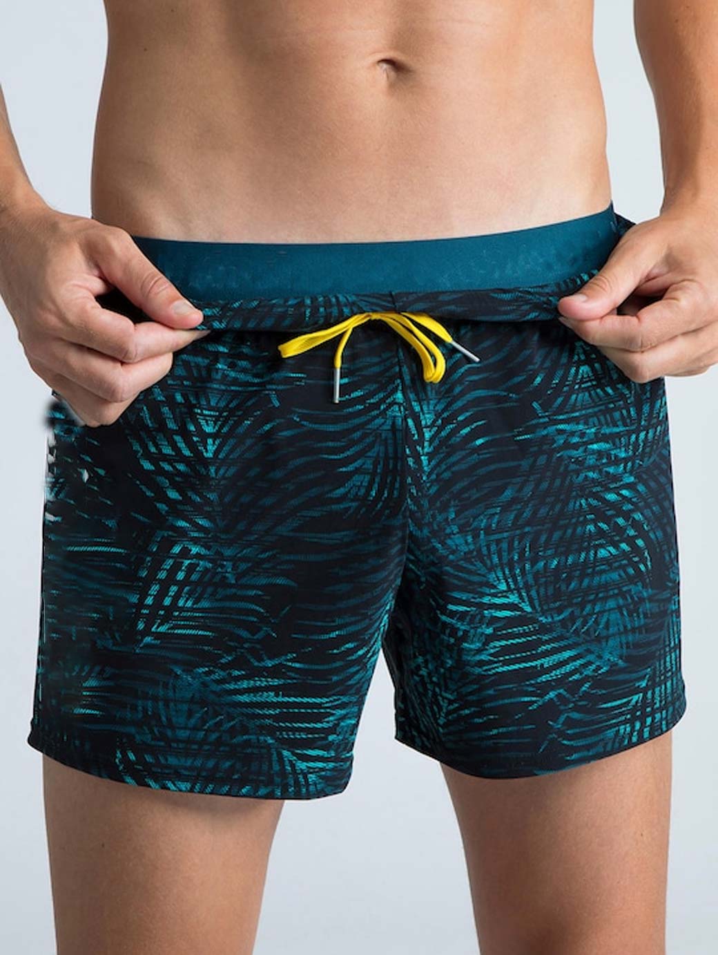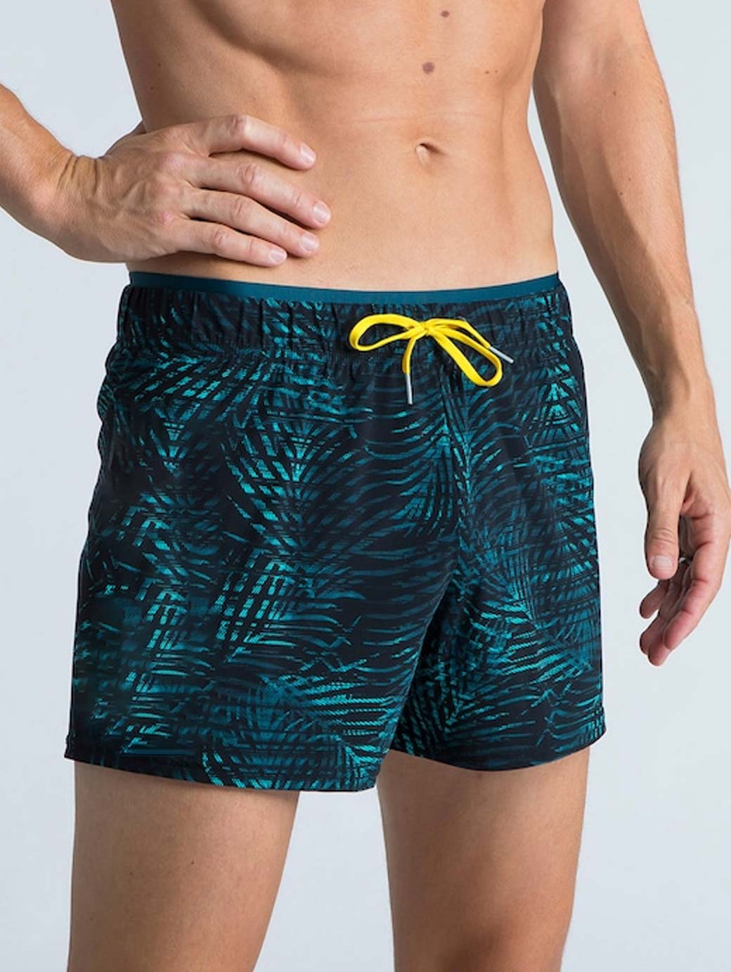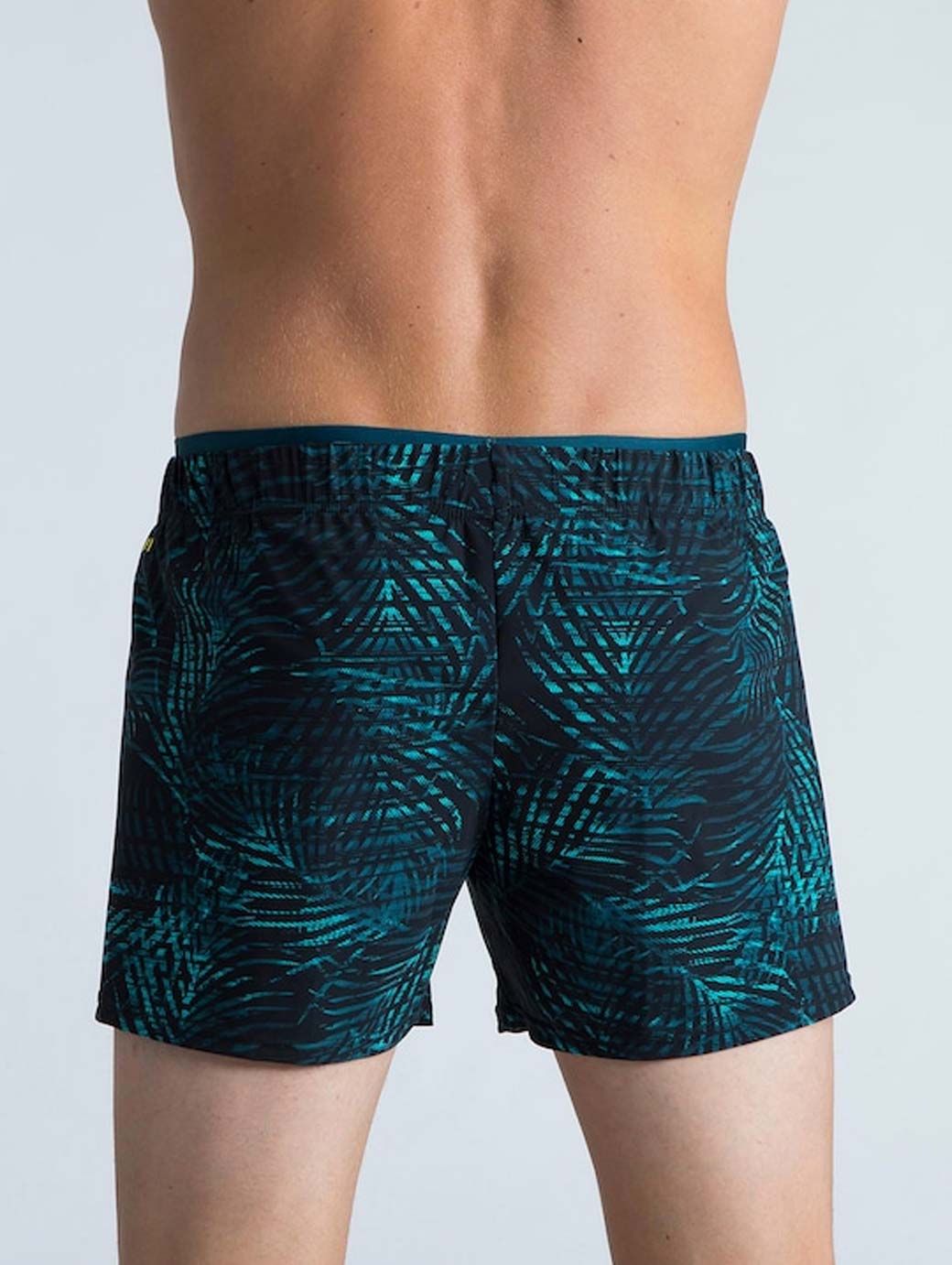 Black & Turquoise blue palm printed water-repellent swim shorts has elasticated waistband with drawstring closure