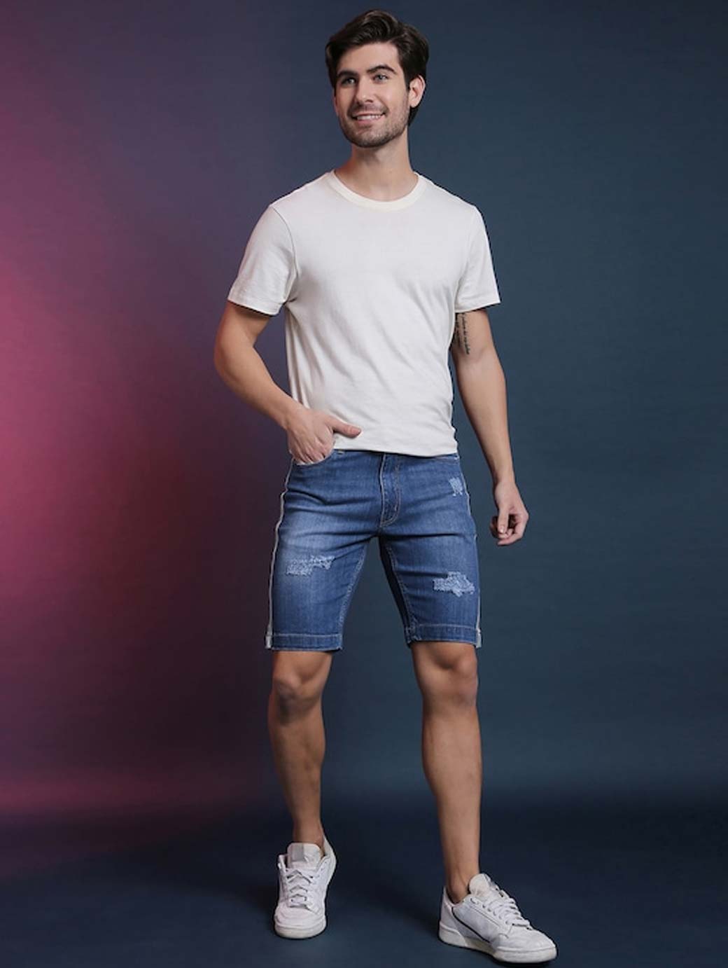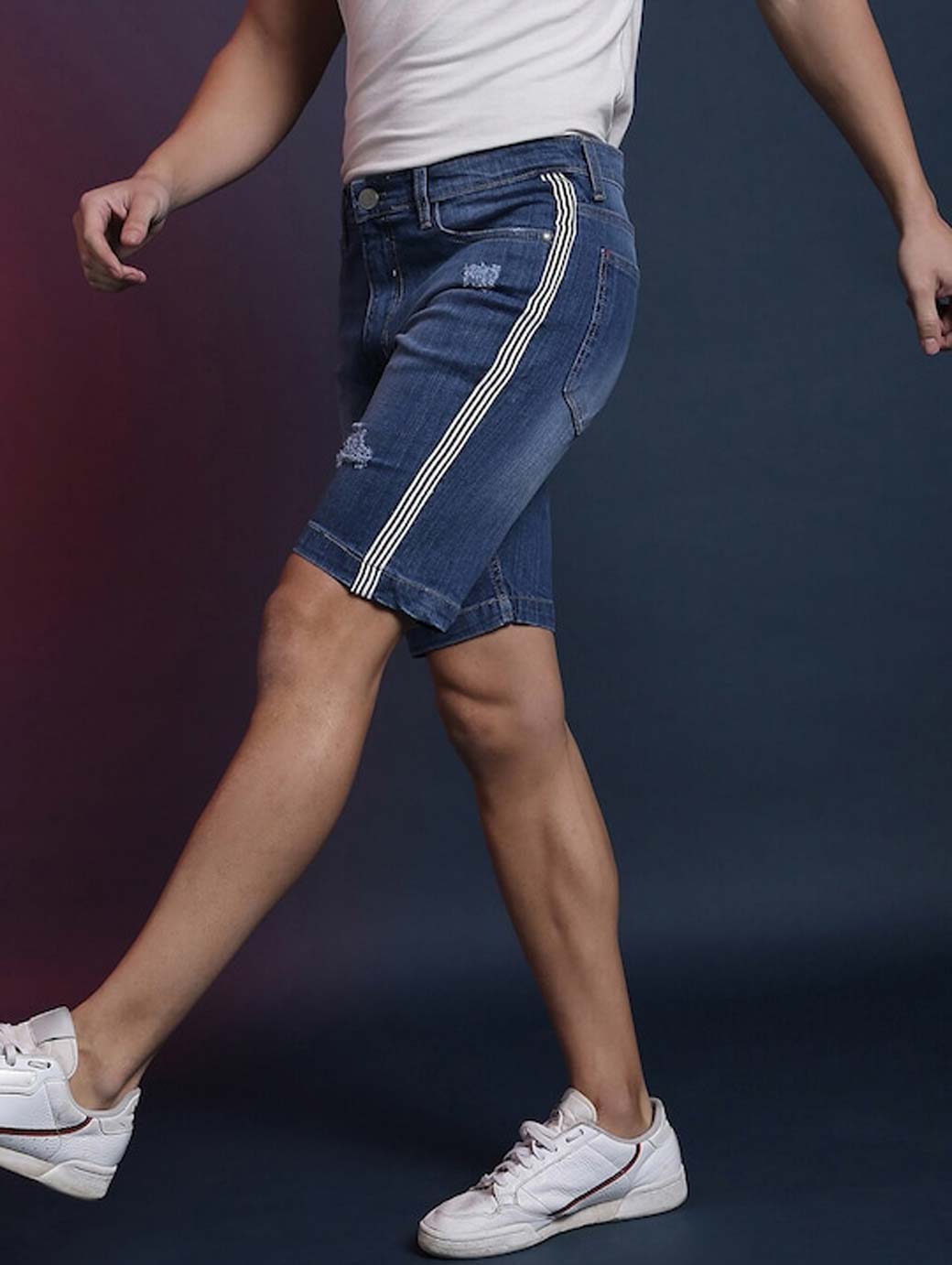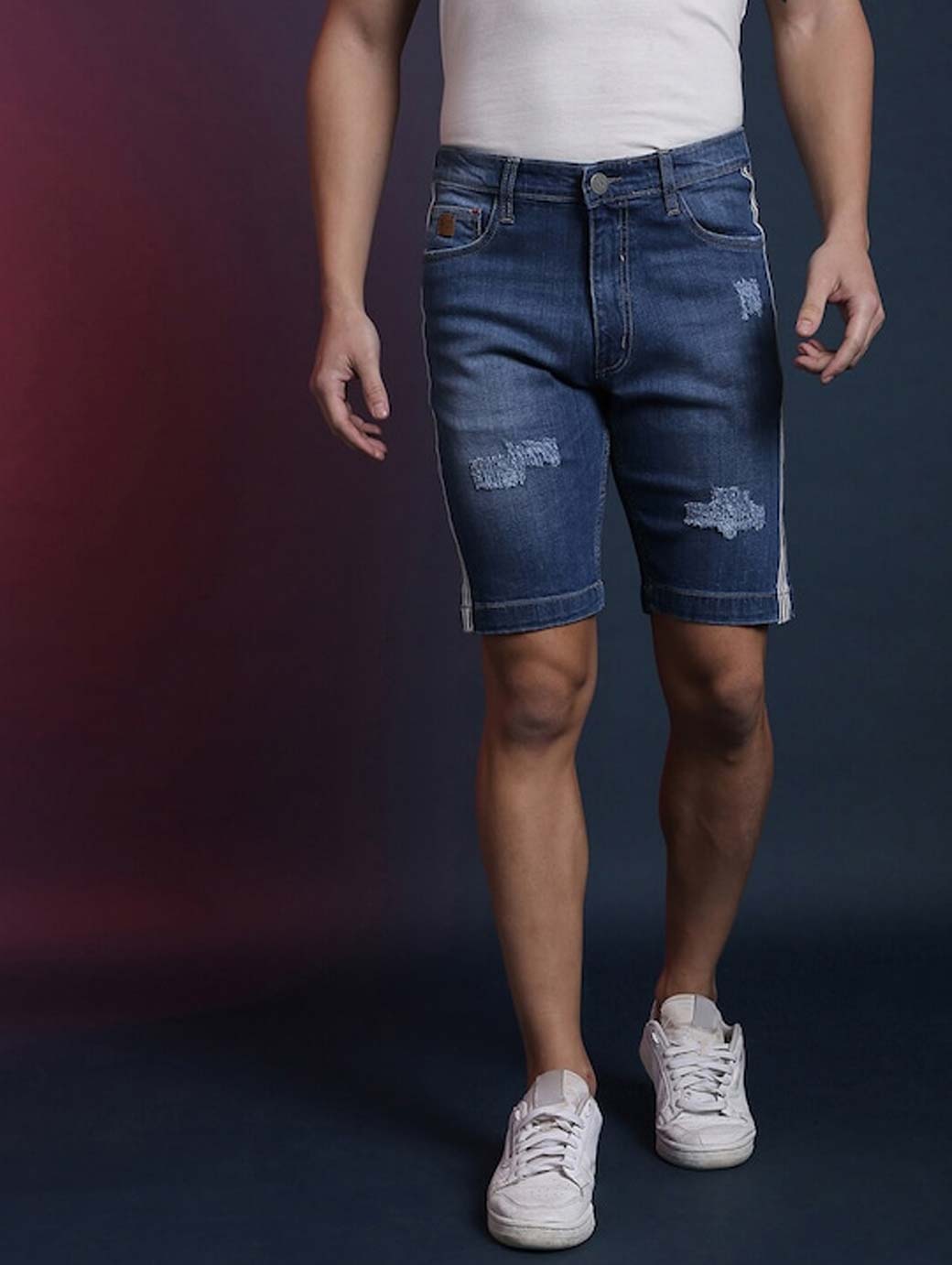 Blue washed mid-rise outdoor denim shorts, has 5 pockets, drawstring closure