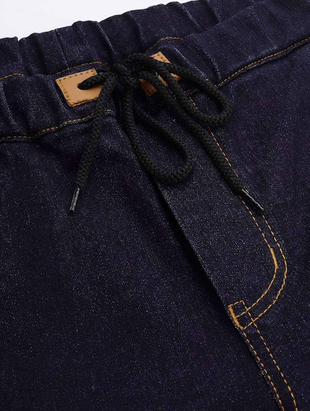 Blue washed mid-rise denim shorts, has 4 pockets, and drawstring closure