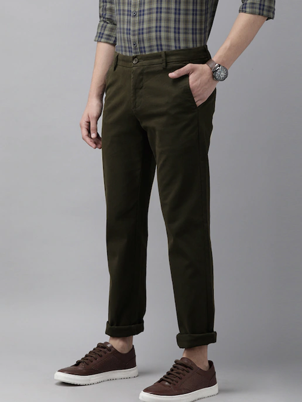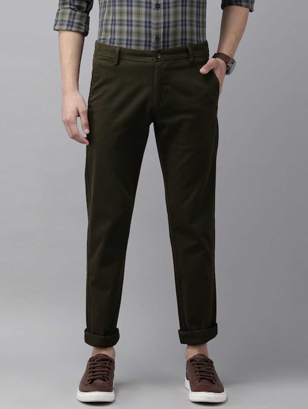 Men Green Solid Slim Fit Trousers