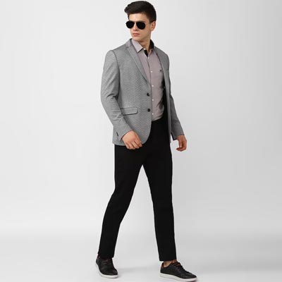 Grey Printed slim-fit single-breasted blazer, has a notched lapel collar long sleeves button closure, a welt pocket, 2 flap pockets, double-vented back hem
