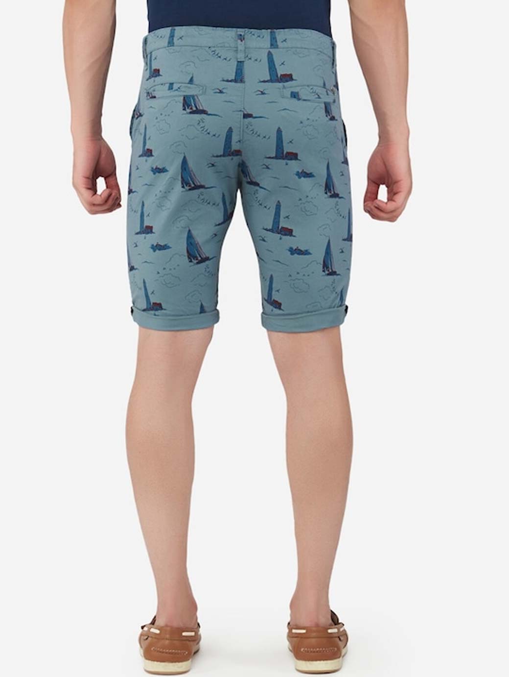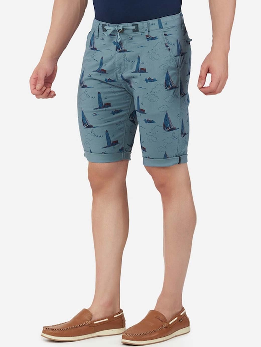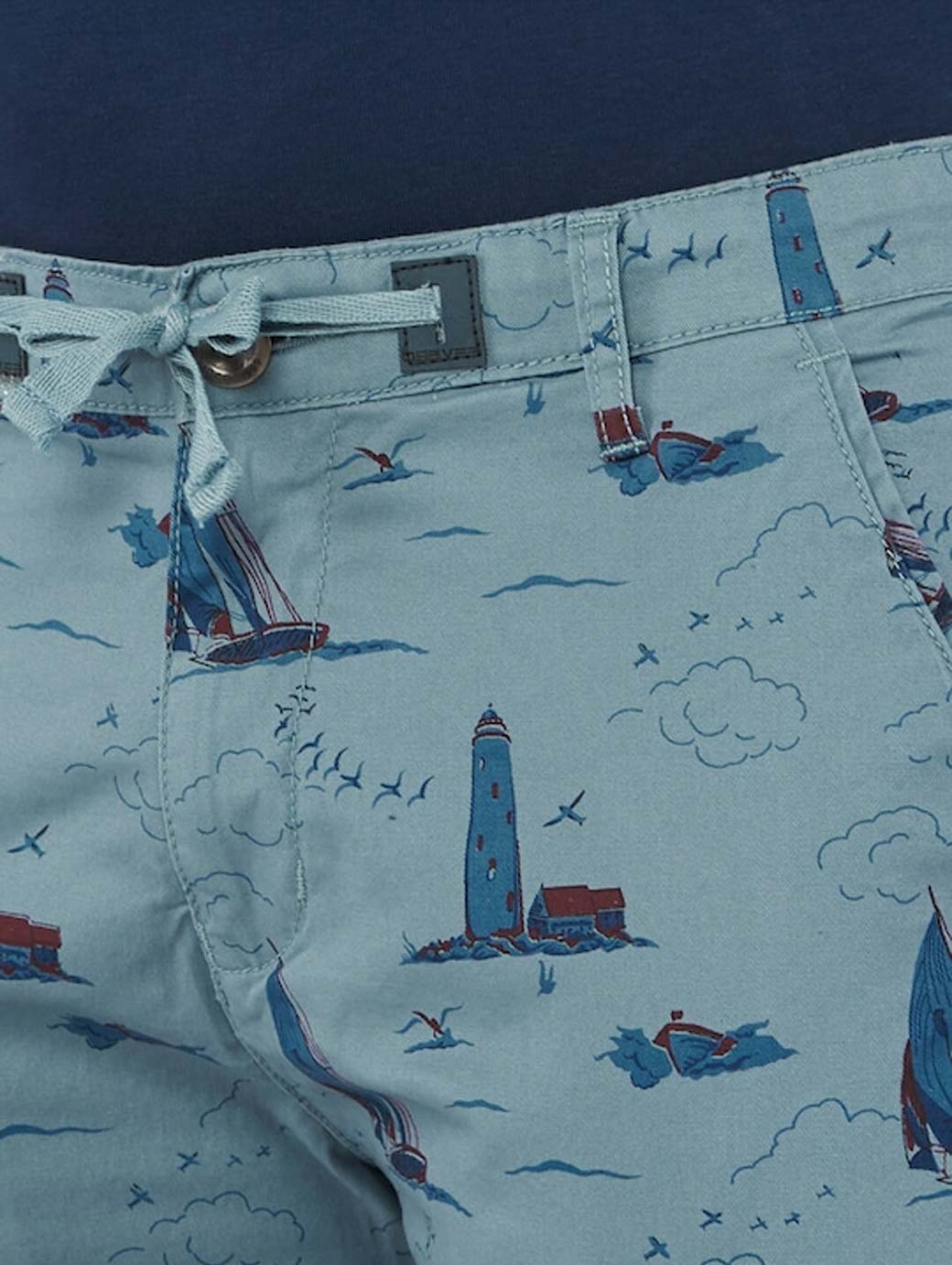 Navy blue conversational printed mid-rise outdoor regular shorts, has 4 pockets, button closure