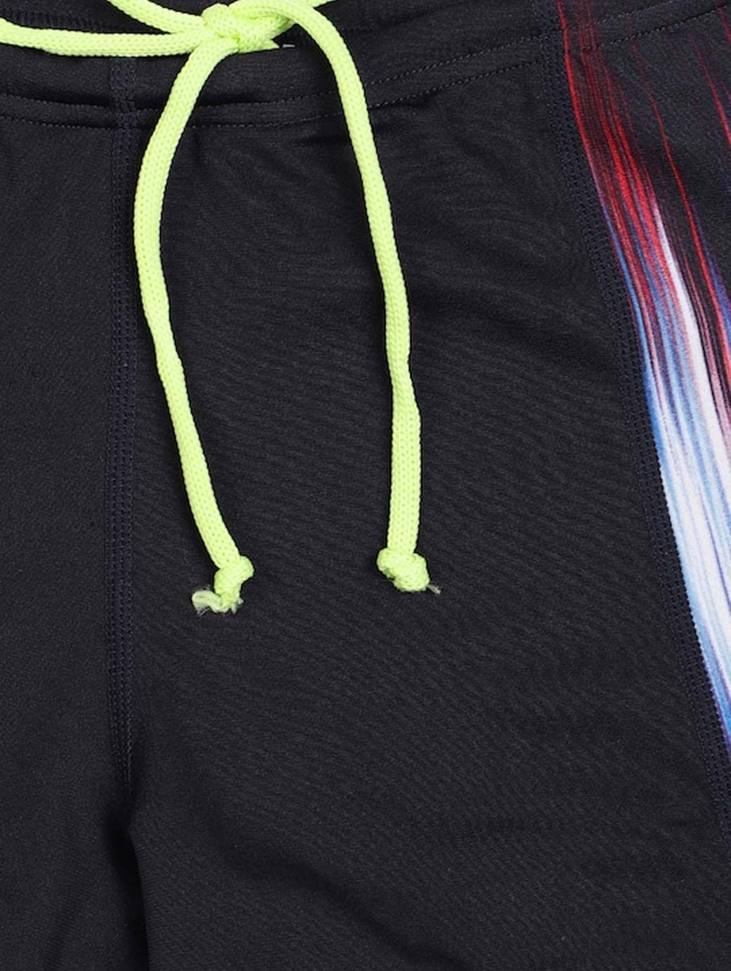 A pair of blue knitted mid-rise swim shorts with printed detail, has an elasticated waistband with a drawstring fastening, 100% chlorine resistant.