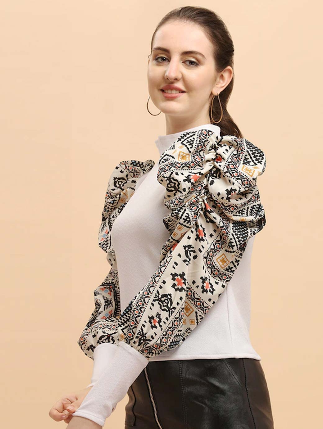 White regular fitted top, Solid High neck, long, puff Ethnic Motifs Printed sleeves Knitted crepe.
