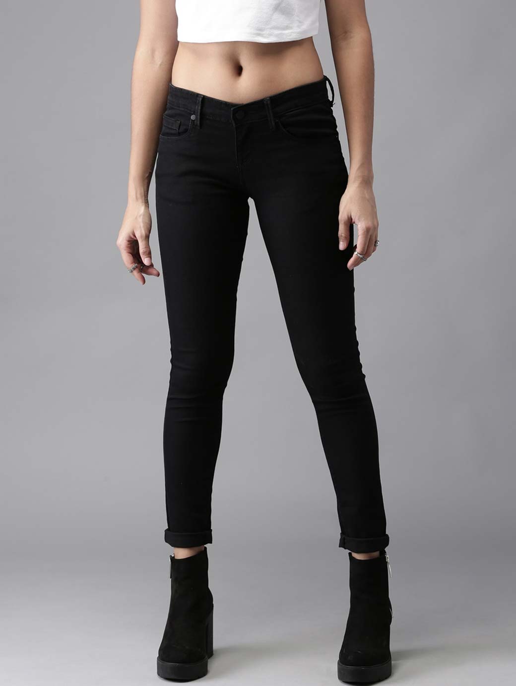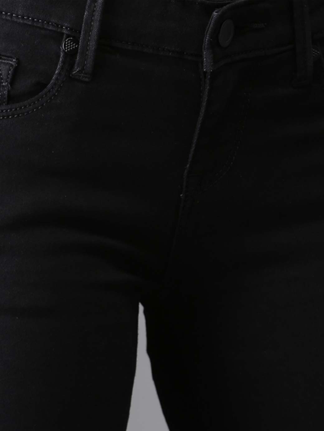 Black dark wash 5-pocket mid-rise jeans, clean look with no fade, has a button and zip closure, waistband with belt loops