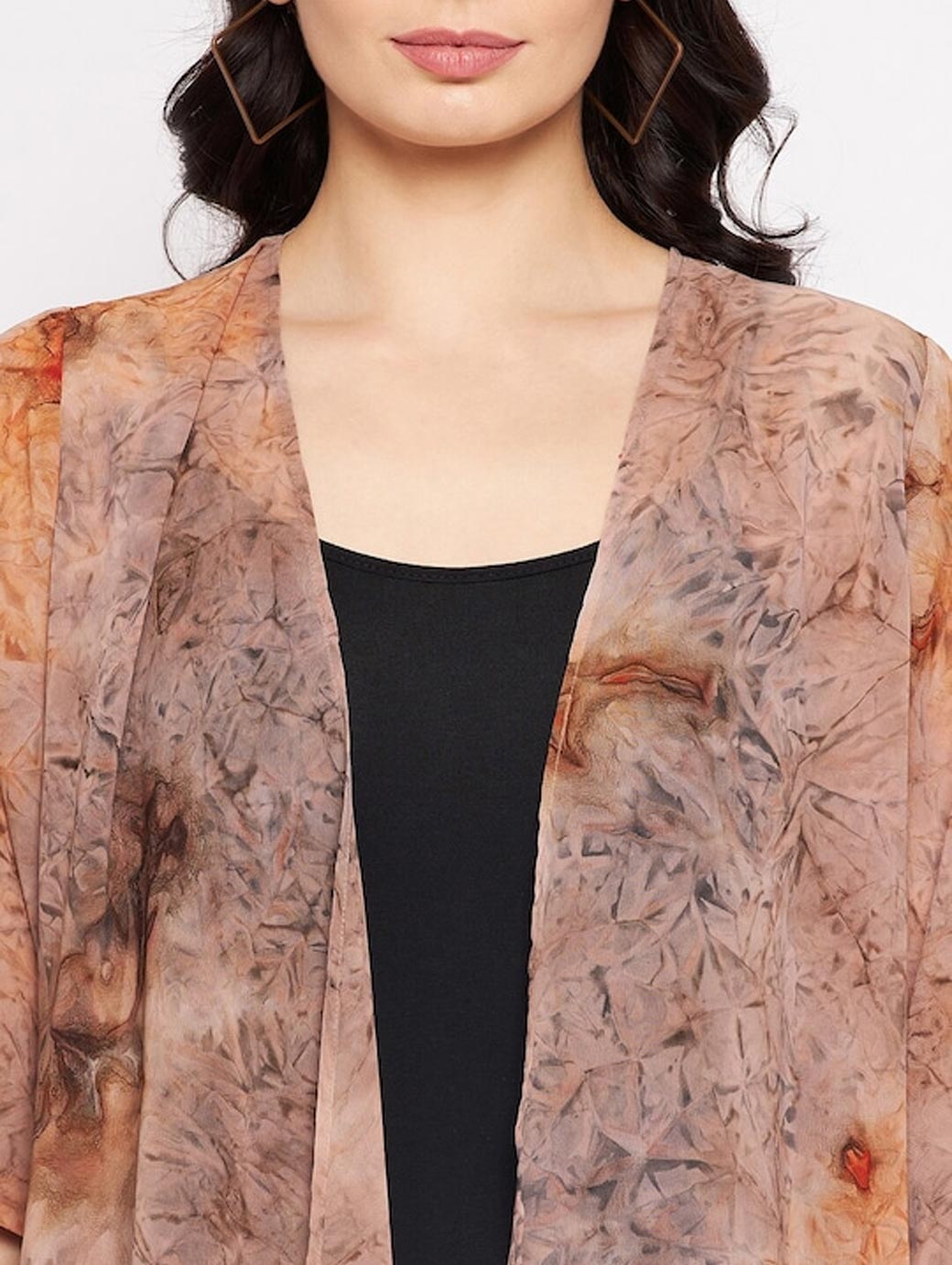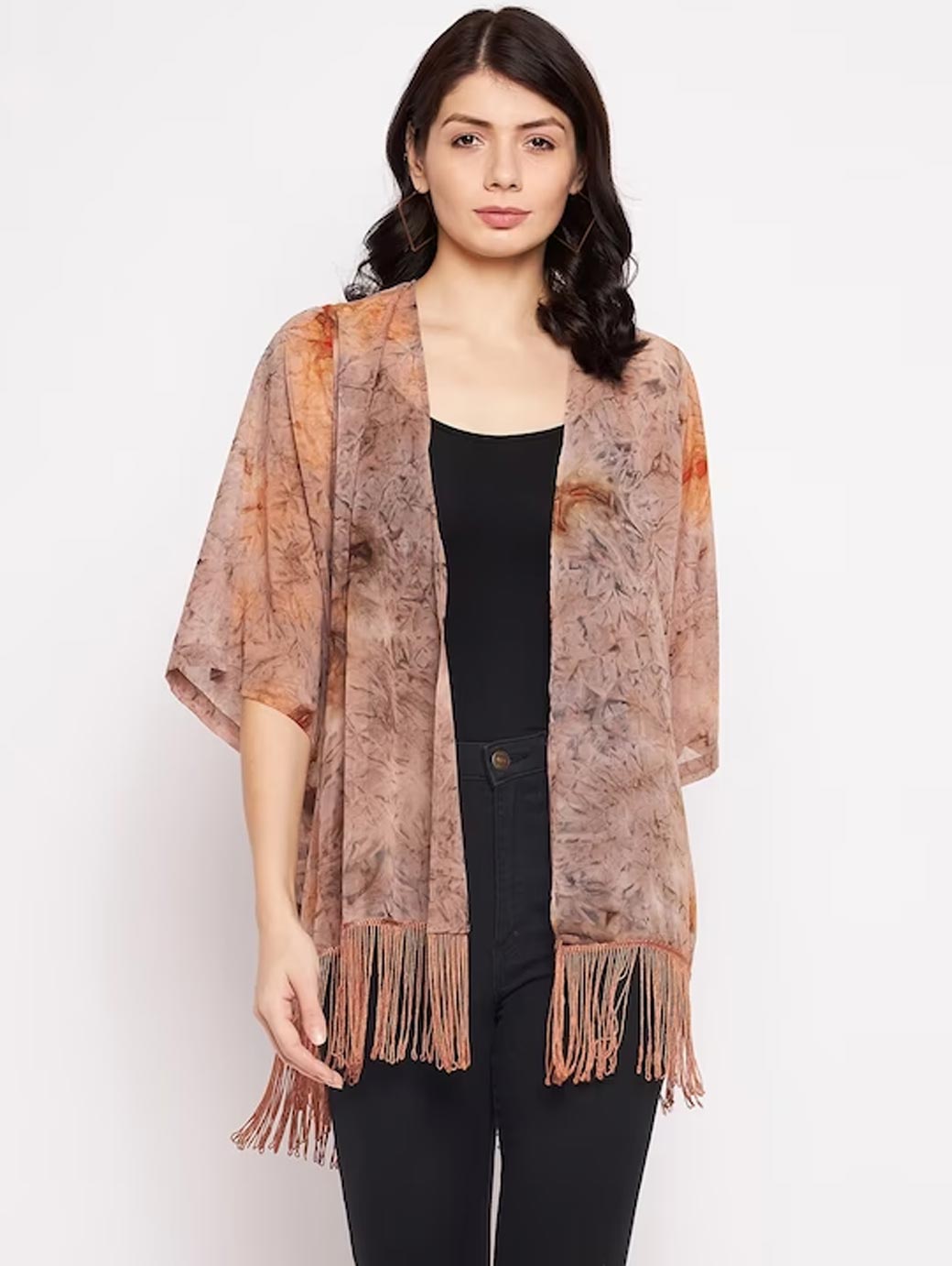 Brown printed open front regular shrug ,has three-quarter sleeves, tasselled detail, high-low hem