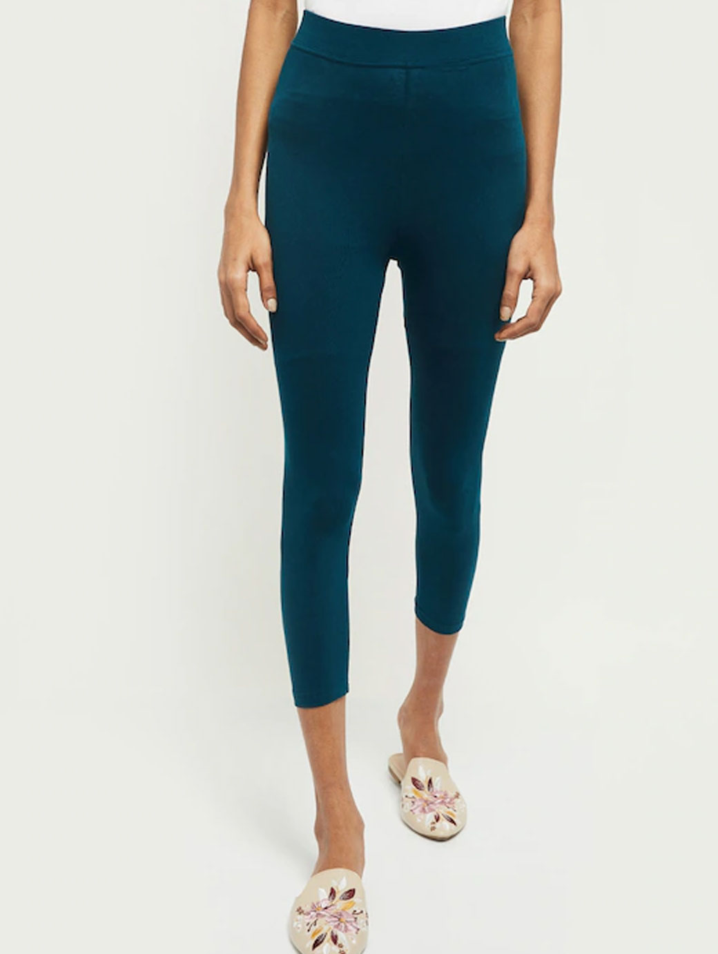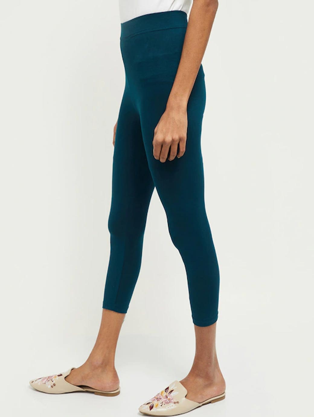 Teal blue solid three-fourth length leggings, has an elasticated waistband with slip-on closure