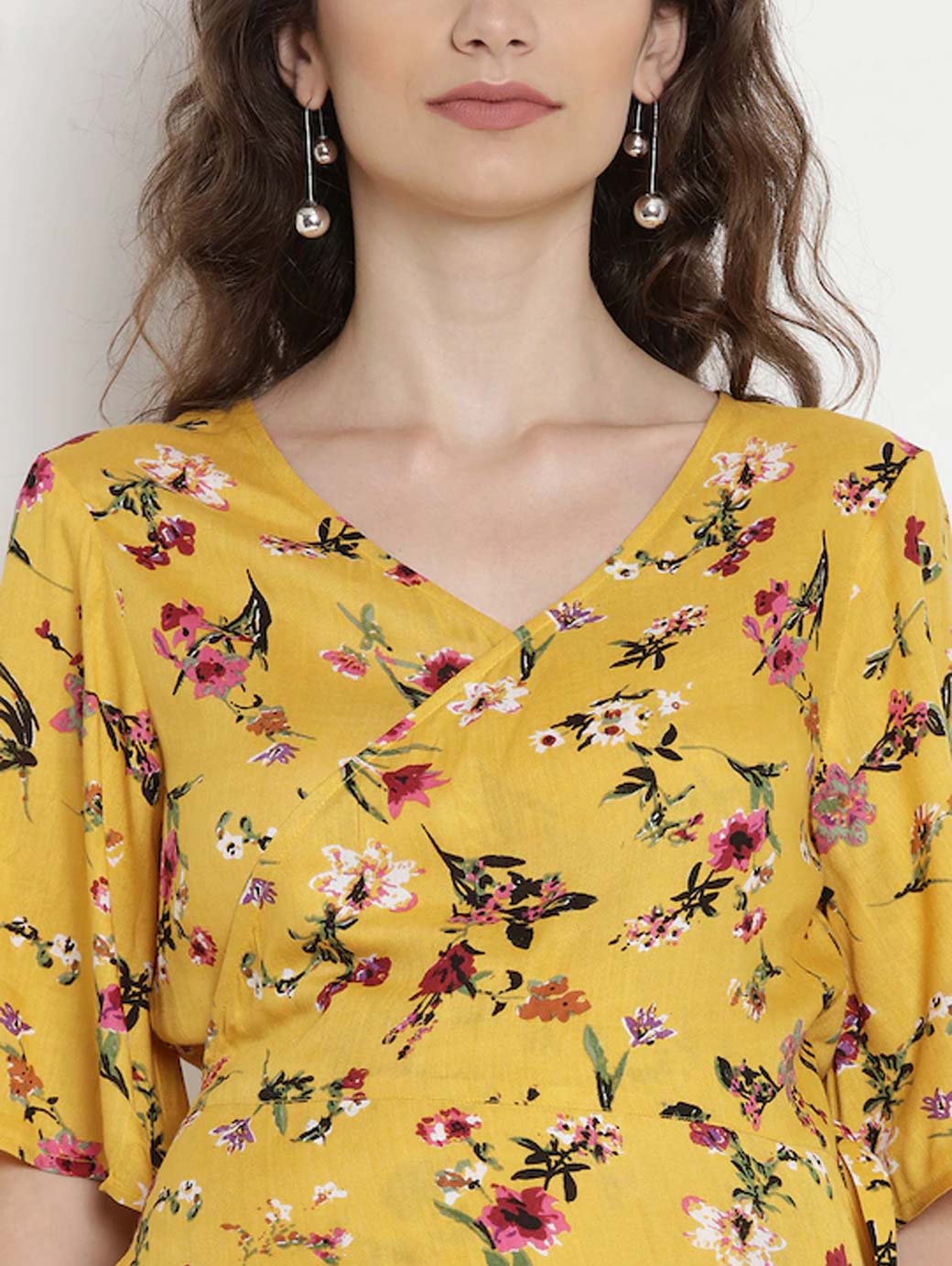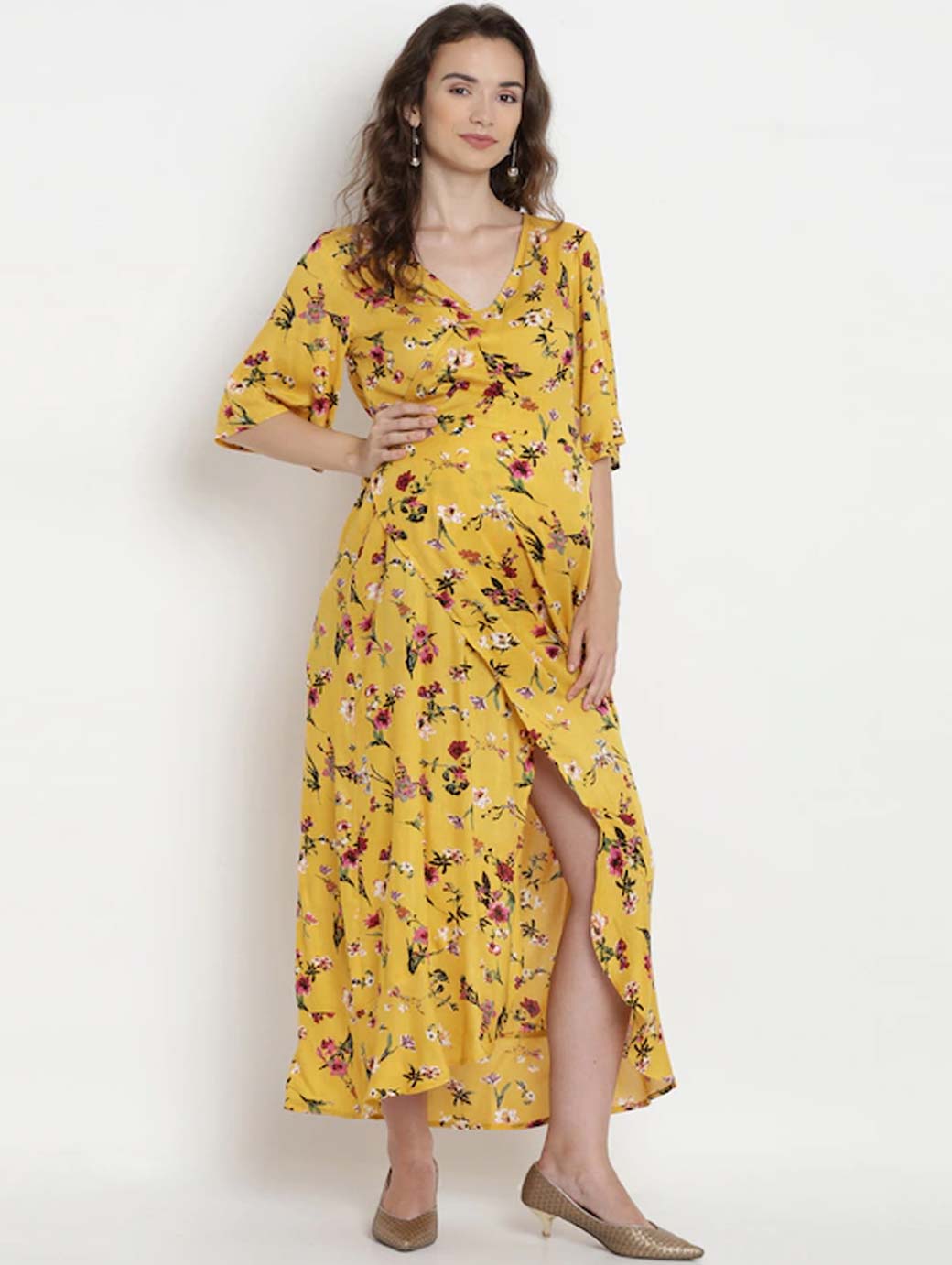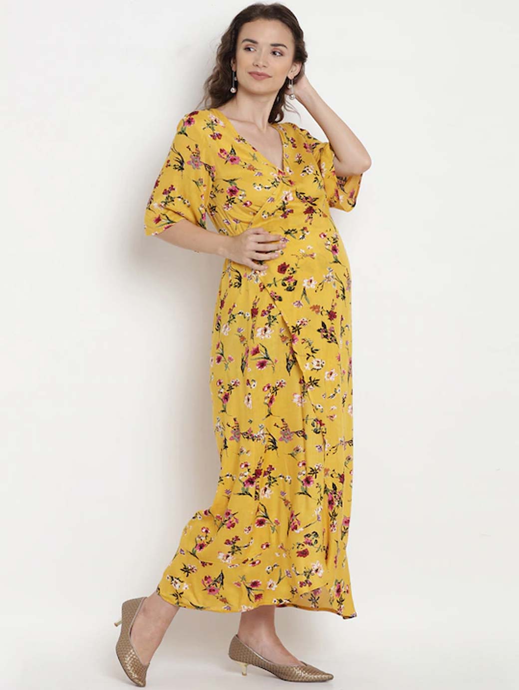 Yellow printed woven maternity wrap dress, has a V-neck, short sleeves, and tulip hem